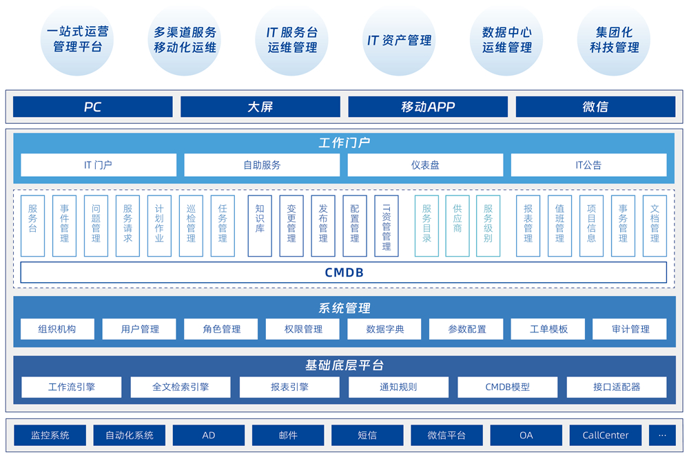 提供一站式 IT 服務(wù)管理咨詢及解決方案,為 IT 服務(wù)數(shù)字化運(yùn)營管理賦能。整個(gè)系統(tǒng)基于 ITIL 最佳實(shí)踐和 ISO20000、ITSS 等標(biāo)準(zhǔn)的 IT 管理的「ERP」,致力于幫助金融、政府、大中型企業(yè)等行業(yè)客戶快速實(shí)現(xiàn)自助服務(wù)臺(tái)、事件管理、IT 資產(chǎn)管理、SLA 管理等核心流程,構(gòu)建以服務(wù)為導(dǎo)向的 IT 服務(wù)管理體系,有效提升 IT 服務(wù)效率和效果,實(shí)現(xiàn) IT 服務(wù)的標(biāo)準(zhǔn)化、可視化、流程化、移動(dòng)化和精細(xì)化管理。