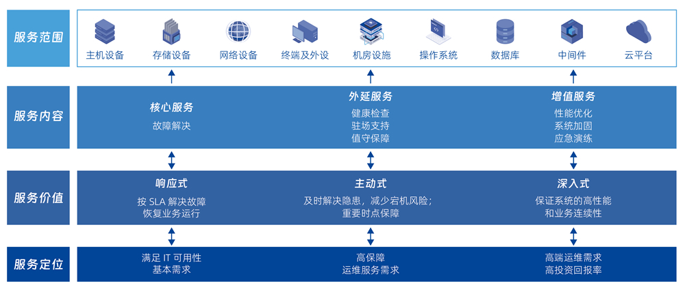 硬件維保(MA)服務(wù):提供主機、存儲、網(wǎng)絡(luò)、終端及外設(shè)、機房設(shè)施等硬件設(shè)備故障解決、健康檢查、駐場支持、值守保障、系統(tǒng)升級加固、應(yīng)急演練等服務(wù)。軟件維保(MA)服務(wù):提供操作系統(tǒng)、數(shù)據(jù)庫、中間件、存儲軟件等軟件產(chǎn)品故障解決、健康檢查、性能優(yōu)化、系統(tǒng)升級等服務(wù)。