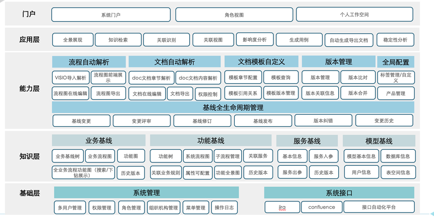 基于流程基線、功能基線、服務(wù)基線、模型基線等,梳理信息之間的關(guān)系,分企業(yè)級(jí)、系統(tǒng)級(jí)、功能級(jí)結(jié)構(gòu)化展示
