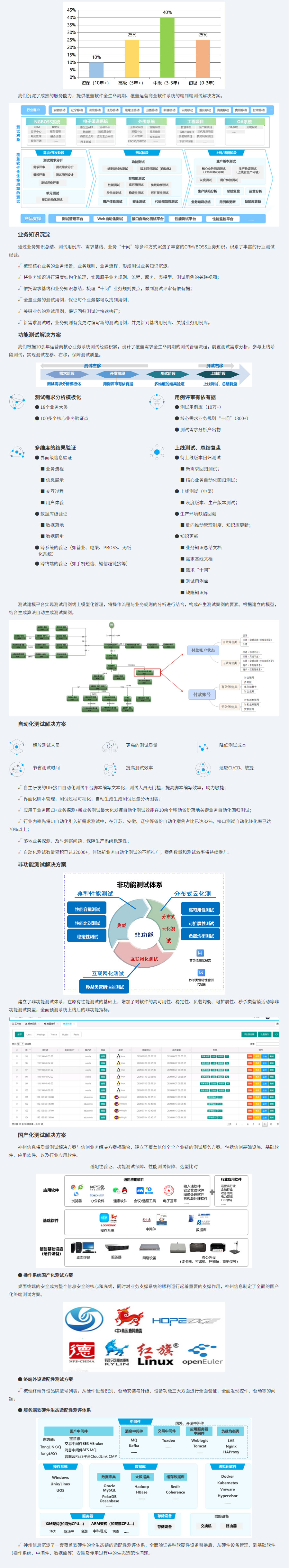 本方案為運營商行業業務系統體系下的測試解決方案,具備成熟的服務體系,專注于為運營商行業提供全面的軟件測試服務。我們擁有18年的測試知識經驗積累,在全國范圍內建立了強大的測試團隊,擁有500+的運營商行業測試技術人才儲備。